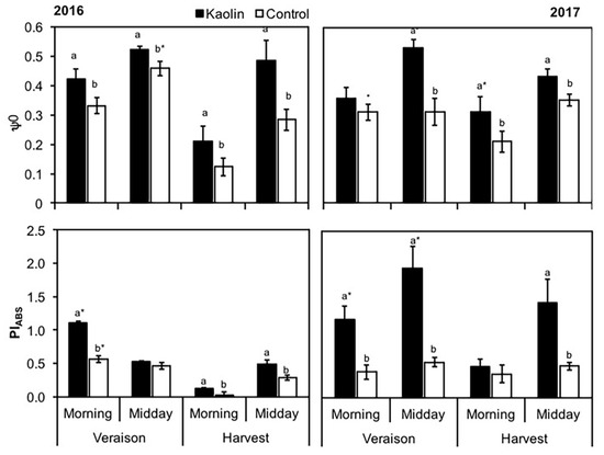 JIP parameters in control and kaolin treated grapevines from veraison and maturation stages in the midday period in 2016 and 2017. Values are presented as mean ± SD (n = 10). Different lowercase letters represent significant differences between treatments (control vs. kaolin), in the same period of the day (morning/midday) within the stage of the season (veraison/maturation), and * represents significant differences between stages of the season within the same period of the day (p < 0.05). Absence of superscript indicates no significant differences.