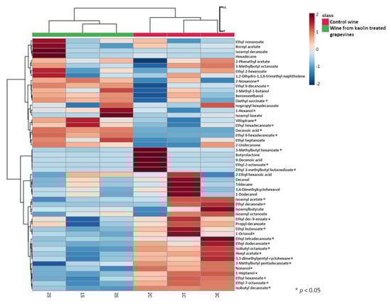 Heatmap and dendrogram representation of the 51 volatile components from ‘Cerceal’ cv. wines under study: control and kaolin treated grapevines, which reveals the distinction among wines. The content of each compound was illustrated through different colors (from dark blue, minimum, to dark red, maximum). Dendrogram for the HCA results using Ward’s cluster algorithm to the data set was also included. Differences corresponding to p < 0.05 were considered significant and were marked with *.