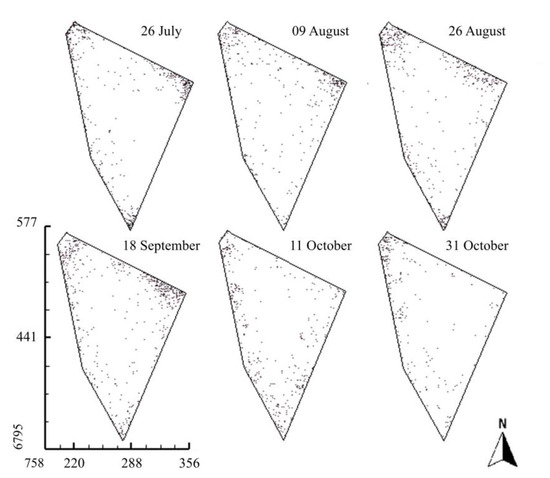 Spatiotemporal distribution of cattle dung patches in the paddock managed under light grazing intensity (sward height of 0.4 m) as a representation of dung distribution over different sampling dates in 2010.