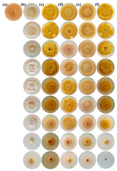 Sensitivity test. Radial growth of mycelium for: (a) control (PDA), (b) COS only, (c) COS–Cys, (d) COS–Gly, (e) COS–Pro, (f) COS–Tyr. From top to bottom: 62.5, 93.75, 125, 187.5, 250, 375, 500, 750, 1000 and 1500 µg·mL−1. Only one replicate is shown.
