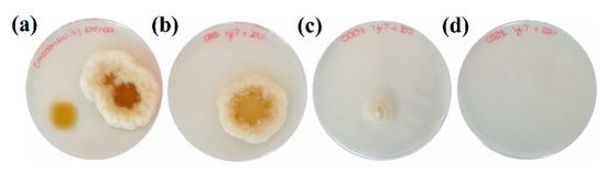 The biological activity of the treatments was determined using the agar dilution method (or “poisoned food method”) [28], incorporating aliquots of stock solutions into the PDA medium to provide final concentrations of 62.5, 93.75, 125, 187.5, 250, 375, 500, 750, 1000 and 1500 µg·mL−1, i.e., the usual ones defined in the Clinical & Laboratory Standards Institute (CLSI) or in the European Committee on Antimicrobial Susceptibility Testing (EUCAST) standard antifungal susceptibility testing procedures. Mycelial disks of F. culmorum (5 mm in diameter) from the edges of a 7-day-old culture were transferred to plates filled with these media (in triplicate), using plates containing only the PDA medium as the control.