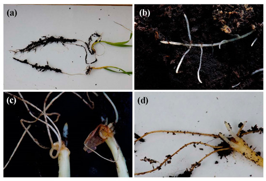 (a) Healthy (top) vs. infected (bottom) seedlings, (b) healthy seedling roots, (c) root rot symptoms, (d) root shortening.