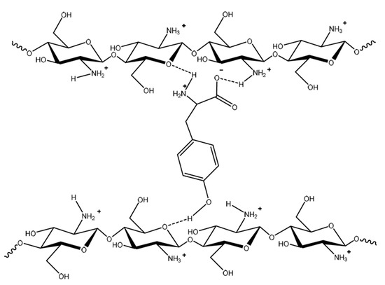The existence of reactive groups in COS has been explored for the conjugation with other small chemical groups that primarily act by modulating the physicochemical properties of the molecule. Conjugation with amino acids entails the formation of hydrogen bonds (Figure 8), already observed in the interaction of chitosan and chitosan oligomers with the hydrophobic amino acid DL-Tyrosine [44].