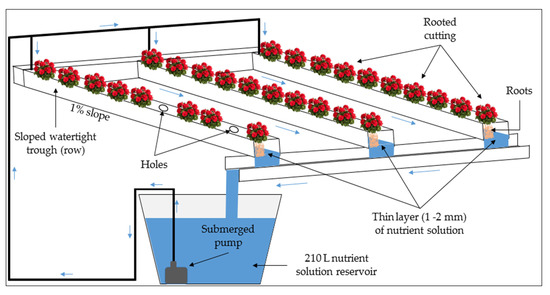 Ornamental plants are typically characterized by a fast growth rate and a large consumption of both nutrients and water, which should be of elevated quality given the limited salt tolerance of these plant species [3]. Furthermore, farmers generally tend to overwater these crops, with the consequence that ornamental plants generally present low water use efficiency (WUE) values. Accordingly, despite the existing variability among ornamental species in terms of water and fertilizer requirements [4], the sector generally accounts for high environmental impact due to the losses of both water and fertilizers [3]. In this scenario, the increasing awareness of environmental pollution caused by agriculture, the scarcity of resources such as water, the need to reduce the production costs, and the growing demand for healthy foods are forcing operators to move towards more sustainable cropping techniques. In greenhouse cultivation, the adoption of soilless culture, coupled with techniques such as fertigation, drip irrigation, integrated plant protection, and climate control, can provide a high-quality product with efficient use of resources, e.g., water, while also increasing the potential yield [5,6,7] as well as decreasing nutrient losses [8]. Soilless culture can be defined as “any method of growing plants without the use of soil as a rooting medium, in which the inorganic nutrients absorbed by the roots are supplied via the irrigation water” [9]. The soilless systems are classified according to the presence and type of substrate, to the irrigation system, and to the nutrient solution (NS) management, namely the reuse or not of the leaching fraction [9], which results, respectively, in the so-called “closed” or “open” loop systems. In open-loop systems, an excessive amount of NS (120–150% of actual water requirements) is supplied to avoid salt accumulation in the substrate, and the leaching fraction is not reused and commonly released into the environment. In closed soilless systems, on the other hand, water supply is generally higher (150–170% of daily water requirements), but the leaching fraction is reused after being disinfected [10]. Accordingly, water and fertilizer saving (which has both environmental and economic benefits), are the main advantages of closed systems. However, closed systems require more complicated NS management that ultimately results in higher equipment and management costs. Primarily, the higher risks of pest outbreak (mainly root diseases) require the disinfection of the leached fraction. Moreover, controlling nutrients and non-essential ions in the recirculating NS becomes more difficult, especially in the case of saline waters or high concentration of non-essential or scarcely absorbed ions (e.g., Na+ and Cl−) [10]. Overall, it is acknowledged that closed systems show a better WUE, at the expenses of possible yield decay in response to salt build-up in the root zone as compared to open systems [5,11,12,13,14,15,16]. Classification of soilless systems may also be done according to those that feature the presence of a solid inorganic or organic medium, which offers support to the plants and systems without substrate (water based soilless systems), where the bare roots of plants lie directly in the NS [9]. Different features characterize the two groups of systems. Soilless systems on substrate are surely the most popular systems for cut flowers and pot ornamentals [17]. Water-based soilless systems are, on the other hand, associated with reduced environmental impact and costs related to the substrate disposal. However, in water-based soilless systems, the resilience to stresses (e.g., drought) is affected by the absence of a buffer offered by the substrate, and a considerably higher risk of outbreak of root-borne diseases may also be experienced [18].