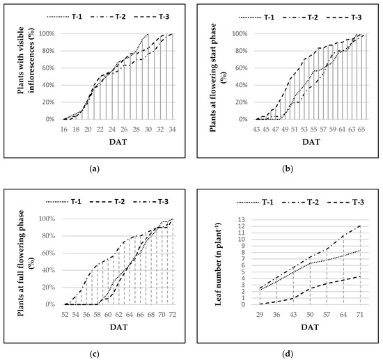 Effect of growing systems on Pelargonium zonale: (a) plants with inflorescences just visible; (b) plants at flowering start phase; (c) plants at full flowering phase; and (d) leaf number. T-1, farm system with substrate; T-2, open-cycle drip system with substrate; T-3, Nutrient Film Technique; DAT, Days After Transplanting.