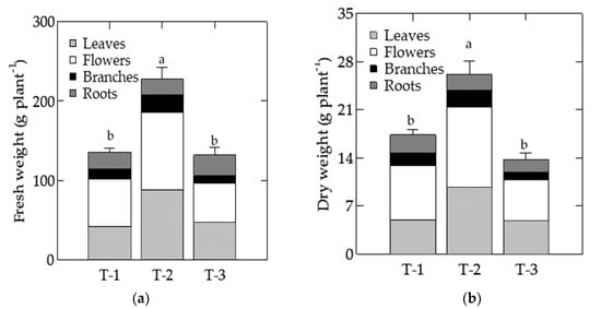 The three soilless systems affected both fresh (Figure 6a) and dry (Figure 6b) weight, which were the highest in T-2 and the lowest in T-3 and T-1. Leaves, flowers, and branches fresh weights had similar behavior of total biomass, presenting highest values in T-2 as compared with T-1 and T-3, while the fresh weight of roots was not affected by treatment (Figure 6a). Among dry weights (Figure 6b), different behaviors were found across organs. Plants grown under T-2 presented the highest leaf and flower dry biomass as compared to T-1 and T-3. On the other hand, higher dry biomass of both branches and roots was associated with T-1 and T-2 as compared with T-3.