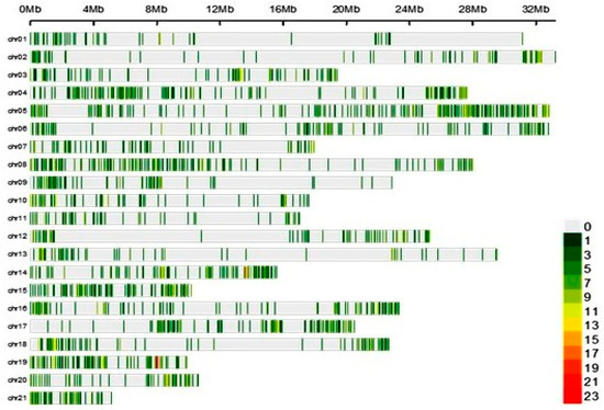 Distribution and density of filtered single nucleotide polymorphism (SNPs) across 21 pseudo chromosomes, as suggested by Tamiru et al. [38]. The horizontal axis displays the chromosome length. The number of SNPs in a given region is indicated at the bottom right.
