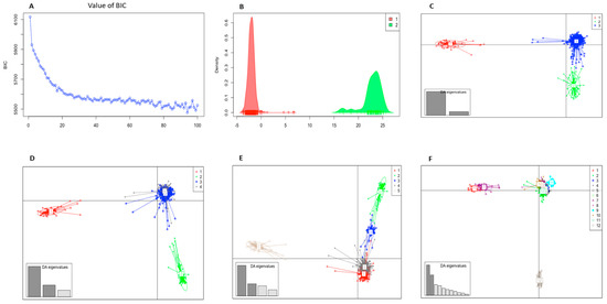 (A) Graph representing number of clusters vs. Bayesian Information Criterion (BIC). In the x-axis, a different number of clusters that could be considered in the population are presented. In the y-axis, the BIC value associated with each number of clusters is presented. (B) Discriminant analysis of principal components (DAPC) with K = 2. (C) Discriminant analysis of principal components (DAPC) with K = 3. (D) Discriminant analysis of principal components (DAPC) with K = 4. (E) Discriminant analysis of principal components (DAPC) with K = 5. (F) Discriminant analysis of principal components (DAPC) with K = 12. The axes represent the first two linear discriminants. Each color represents a cluster and each dot represents an individual.
