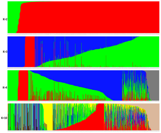Population structure with K = 2, 3, 4, and 10 for 803 Dioscorea genotypes using 3432 SNPs. The genotypes represented by vertical bars along the horizontal axis were classified into K color segments based on their estimated membership fraction in each K cluster. Accessions on the x-axis were sorted in the same order for each K.