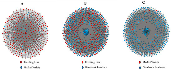 The genetic networks obtained using QGRAPH. The figure represents networks for all genetic groups with the node size depicting genetic relationships among different genotypes based on the observed heterozygosity and allelic richness. (A) Network analysis between breeding lines and market varieties; (B) Network analysis between breeding lines and genebank landraces; (C) Network analysis between genebank landraces and market varieties.