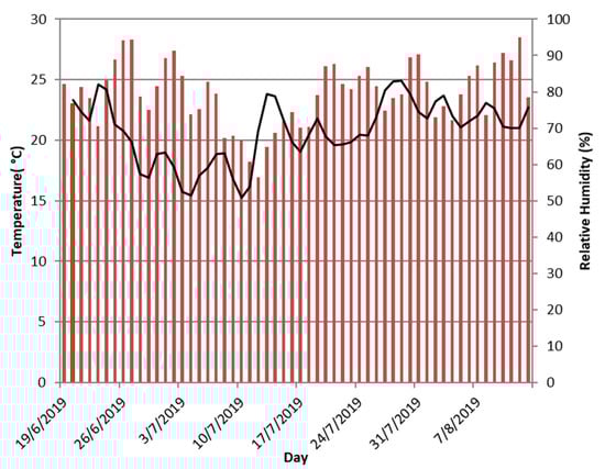 The used, popular eggplant cultivar ‘Madonna’ has evenly coloured, dark-violet fruits. Due to slow seed germination, all four eggplant rootstock seeds (SH, A, ST, and SI) were sown 10 days earlier than cv. ‘Madonna’ and tomato rootstocks seeds (E and O) (which germinated and developed at the same rate); thus, a uniform stem diameter for grafting was obtained. Eggplant seedlings (with the adequate diameter and 4–5 leaves) were grafted onto the rootstocks by cleft grafting method and kept in high humidity and low light conditions for one week, and then acclimatized to the natural conditions. Three weeks after grafting, all seedlings were transplanted into 10 L pots containing peat substrate, in an unheated polyethylene greenhouse. Temperature and relative humidity inside the greenhouse were recorded by the Flower Power Sensor data logger, as shown in Figure 1. All phytotechnical work recommended for eggplant greenhouse cultivation was performed uniformly. Irrigation was applied twice a week with a commercial fertilizer solution.