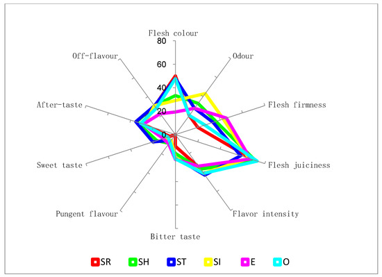 Sensory analysis data showed a significant difference in four parameters (flesh colour, firmness, sweet taste, and intensive odour) between selected rootstocks. Fruits harvested from SR, ST, and O had lighter flesh colour than other rootstock combinations. Respectively, SR and E had the lowest and highest flesh firmness between grafting combinations according to panellists’ evaluation. Grafting onto ST showed significantly stronger sweet taste as compared to SR fruits. Fruits harvested from SI showed significantly intensive odour among all combinations (Figure 3). Bitter taste, pungent flavour, off flavour, aftertaste, flesh juiciness, and flavour intensity were not significantly influenced by grafting.