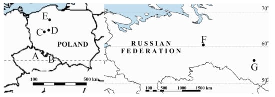 Location map of study peatlands. A: Great Batorowskie Peat Bog; B: Zieleniec Mire; C: General Dezydery Chłapowski Landscape Park; D: Wrześnica River valley; E: Stążka Mire; F: Mukhrino; G: Tagan Mire.