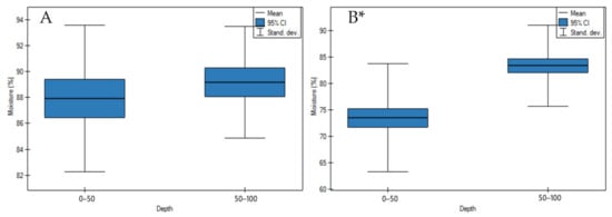 Moisture values on: (A) undrained, (B) drained peatlands in 0–50 cm and 50–100 cm layers. * indicates statistically significant differences (p < 0.05) as revealed by ANOVA. (For all cases n = 60).