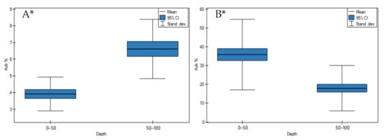 Ash values on: (A) undrained, (B) peatlands in 0–50 cm and 50–100 cm layers. * indicates statistically significant differences (p < 0.05) as revealed by ANOVA. (For all cases n = 60).