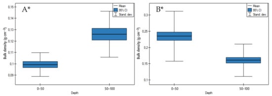 Bulk density values on: (A) undrained, (B) drained peatlands in 0–50 cm and 50–100 cm layers. * indicates statistically significant differences (p < 0.05) as revealed by ANOVA. (For all cases n = 60).