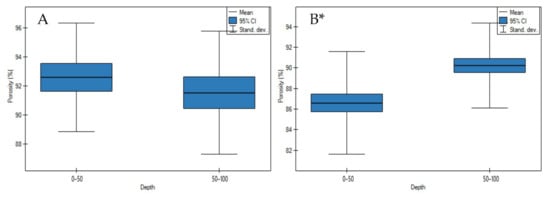 Porosity values on: (A) undrained, (B) drained peatlands in 0–50 cm and 50–100 cm layers. * indicates statistically significant differences (p < 0.05) as revealed by ANOVA. (For all cases n = 60).