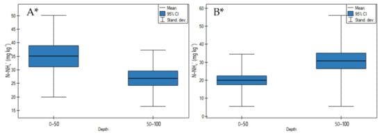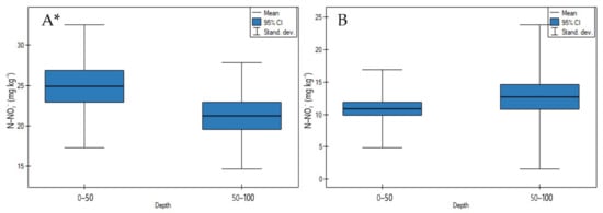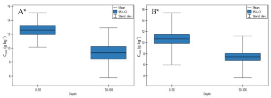 To determine whether the differences between the two means with the depth (0–50, 50–100 cm) are statistically significant, the p-value was compared to the significance level to assess the null hypothesis. The null hypothesis states that the means are equal (H0: µ1 = µ2). The alternative hypothesis (H1: µ1 ≠ µ2) states that the means are not equal. If the p-value was less than or equal to the alpha (p ≤ 0.05), then we rejected the null hypothesis and we said the result was statistically significant. If the p-value was greater than alpha (p > 0.05), then we failed to reject the null hypothesis, and we said that the result was statistically nonsignificant.