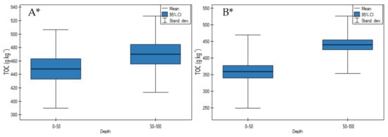 TOC contents on: (A) undrained, (B) drained peatlands in 0–50 cm and 50–100 cm layers. * indicates statistically significant differences (p < 0.05) as revealed by ANOVA. (For all cases n = 60).