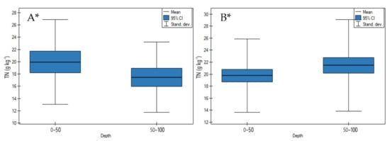 On undrained peatlands, in depth, a significant decrease of TN concentrations was observed (Figure 8A, p < 0.05). While on drained peatlands a significant increase of TN concentrations in depth was shown (Figure 8B, p < 0.05).