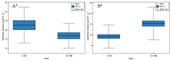 Xanthine oxidase activity (XOA) (EC 1.17.3.2) was determined by the Krawczyński method [28]. Xanthine was used as a substrate for the measurement of xanthine oxidase activity in fresh peat samples. Total of 0.25 g soil was extracted with 50 mL of 0.1 M phosphate buffer (pH = 7.5) and incubated for 4 h at 37 °C. The substrate was filtered and centrifuged at 4000 r.p.m. for 10 min. The mixture consisted of 2.5 mL of the test solution and 2.0 mL of the substrate solution (6.6 mM xanthine). It was incubated for 30 min at 37 °C. The reaction was stopped by the addition of 0.5 mL 0.58 M HCl. A blank was prepared in the same way, but in the place of 2.0 mL 0.1 M phosphate buffer (pH = 7.5), xanthine solution was added. The absorbance was measured at λ = 290 nm.