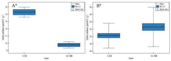 Urate oxidase activity (UOA) (EC 1.7.3.3.) was determined by the Martin-Smith method [29]. About 5 g peat soil was placed in 250 mL conical flasks, and 100 mL of 0.05 M phosphate buffer (pH = 7.5), 5 drops of toluene was added. The mixture was incubated for 16 h at 24 °C, then filtered and centrifuged at 4000 r.p.m. for 20 min. Next, 4 mL substrate was incubated with 2 mL uric acid for 24 h at 24 °C. A blank was prepared in the same way, but in the place of phosphate buffer, deionized water was added. The absorbance was determined at λ = 293 nm.