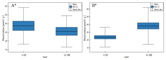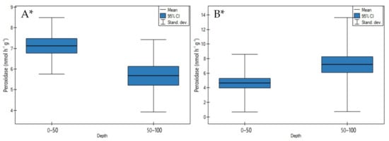 Our study results on drained peatlands were in line with the results of Tian et al. [65], who showed that this enzyme is closely related to soil organic matter transformations and suggested that it has too high a level of in situ oxidation conditions in the upper layer limited by peroxidase activity on drained peatlands. Moreover, Dec et al. [66] observed the influence of the long-term storage of carbon in soils and the biological availability of soil nitrogen on the accumulation of relatively stable peroxidases in the bottom layer. These variables suggested a higher peroxidase activity with the advancement of phenolic compounds transformation and the synthesis of macromolecules such as humic and fulvic acids in the bottom layer [67,68].