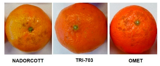Finally, the skin damage index (SDI) revealed a different susceptibility among cultivars to display skin damage during cold storage (Table 2). The varieties that showed susceptibility to low temperatures were Nadorcott, with several fruit displaying slight skin damage at the end of the study period (SDI = 0.15), and Omet, that manifested moderate damage after 30 storage days plus SL (SDI = 0.39). Skin damage was manifested as brown pitted-like depression on flavedo (Figure 1). For Tri-703, incipient skin damage was detected after 30 storage days in only a few fruit, which resulted in an extremely low SDI value, 0.07, after SL.