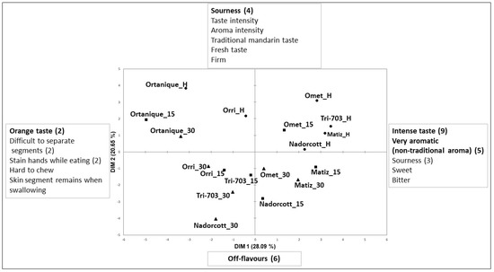 It is worth mentioning that for Ortanique, no remarkable sensory evolution occurred during storage because after the two storage periods, these samples still remained very close to the sample at harvest time. Similarly, sample Omet_15 was also allocated close to Omet_H.