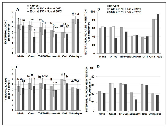 The mean acceptability scores and purchase intention based on the external and internal evaluations made by consumers at harvest time and after the SL period that followed 15 and 30 cold storage days are shown in Figure 3.
