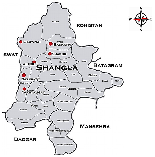 District Shangla is a hilly area comprising Besham, Shahpur, Aloch, Chakesar, Damorai and Olander sub tehsils [27] with; 34, 31 to 33°, 08° N latitude and 72, 33 to 73°, 01° E longitude, at an elevation of 3164 m above sea level with a total area of 1586 square kilometers, located in the north of Peshawar the capital of Khyber Pakhtunkhwa province Pakistan (Figure 1). District Shangla have renowned mountain tops like Spinghar (4464 m), Takhtghar (4332 m), Dobandighar (4063 m), Yakhghar (4179 m), Koparsar (3278 m) and Spinsar (3181 m) [28,29]. The extreme temperature of the area is 38 °C in summer however in winter season it goes down up to −2 to −5 °C. The soil is sandy loam to clay. Rainy season starts from July to September while snow falls from December to February [30].