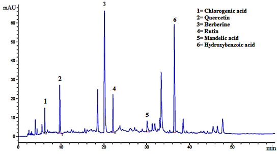 The HPL-UV chromatogram of B. Lyceum root Me. Ext is shown in Figure 2. A total of six phenolic compounds were identified when compared to the standard chromatogram. The respective peak position, retention time and concentration of identified phenolic compounds are given in Table 4. The identified compounds from the HPLC chromatogram as shown in Figure 2 were quercetin, chlorogenic acid, berberine, rutin, mandelic acid and hydroxy benzoic acids with retention times of 9.6, 6.2,20.1, 22.2, 30.1, and 36.4 min, respectively.