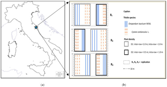 For O. tauricum Willd. and C. cardunculus L. we compared two different plant densities—D1 (inter-row = 1 m; intra-row = 1 m) and D2 (inter-row = 1 m; intra-row = 0.5 m)—according to a split plot experimental design scheme with three replications. For each plot that represented plant density, we had two sub-plots representing each species. Each sub-plot contained three rows; each row included 10 plants, giving a total of 30 plants for each sub-plot.