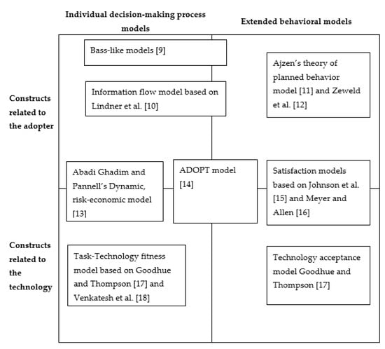 Secondly, we reviewed a sample of conceptual models used as the basis to build the numerous numerical models in the adoption literature. Figure 1 shows the models or studies that we have chosen as examples. The selection of these examples was based on their ability to illustrate the different disciplinary perspectives used to explain adoption and their ability to illustrate the wide range of variables that have been used in subsequent empirical studies; in this study, they were broadly classified into two dimensions according to the nature of their concepts: those more focused on the characteristics of the adopter and those more focused on the characteristics of the technology, and whether the models were more focused on understanding the individual process of decision-making, or incorporated external influences into the adoption decision (i.e., extended behavioral models).