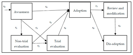 Some authors use a step-hazard approach to represent the different stages of the adoption process as a way to better understand the transitions between them [31]. The duration equations to move from one state to the next are assumed to be determined by different processes. The step-hazard approach has been successfully used to represent Rogers’ adoption process in several studies [32], and there are some examples in the marketing literature using a step-hazard approach at a national or international level [26,32,33]. However, there are very few similar studies in agriculture (e.g., [34,35]). Figure 2 shows how the adoption process proposed by Pannell et al. [30] can be represented as a step-hazard model.