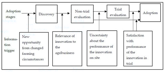 Lindner et al. [10] outlined the basic process driving the time lag from the availability of agricultural innovation to the individual decision to adopt it: the discovery stage—the time it takes for the producer to be aware of the existence of the innovation, the evaluation stage—the time from awareness to first use, on a trial basis, and the trial stage—the time from the initiation of trial use to the acceptance of the innovation.