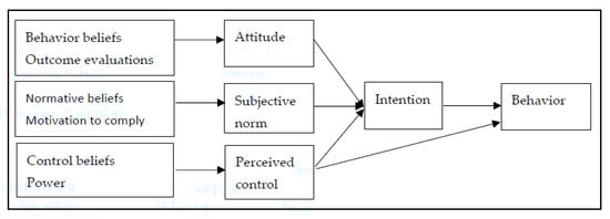 In the TPB, attitudes are assumed to be causally related to rational behavior when the decision-makers have control over decisions. However, this rational process is affected by both subjective norms and perceived control. Figure 6 shows the TPB model characterizing the influences in the decision-making process as proposed by Ajzen [11], and Figure 7 shows a recent example of the TPB applied in agriculture.