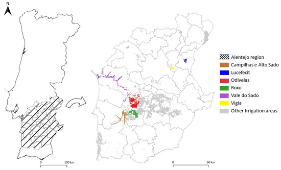 The Irrigation Communities (ICs) selected for this case study are among the most economically important ones in the Alentejo region—Campilhas e Alto Sado, Lucefecit, Odivelas, Roxo, Vale do Sado and Vigia. The total irrigated area and the area cropped by the main crops of each IC are presented in Table 1. Figure 1 shows the location of the six ICs. Campilhas e Alto Sado and Odivelas differ from the other ICs since they manage more than one Irrigation District (ID). Each ID consists of an individual irrigation network, managed independently of the others.