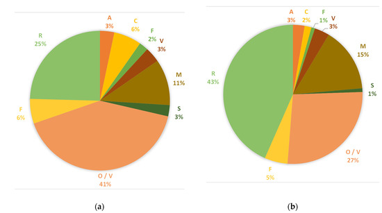 Proportion of the (a) cropped area per crop over the total cropped area and (b) the water usage per crop over the total water consumption across all ICs. A—Almond Orchards; C—Cereals (except maize); Fr—Fruit Orchards; V—Vegetables; M—Maize; S—sunflower; O/V—Olive Orchards and Vineyards; F—Fodder crops; R—Rice