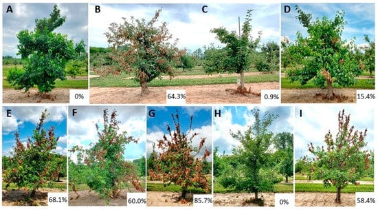 Examples of fire blight severity in the main collection. (A) Robusta 5 (M. robusta) (B) ‘Ribston’ (M. domestica) (C) ‘Honora’ (M. domestica) (D) ‘Sugar crab’ (Malus hybrid) (E) ‘Royal Gala’ (M. domestica) (F) KAZ 96 08-17 (M. sieversii) (G) ‘Skryzhapel’ (M. domestica) (H) GMAL 3173 (M. baccata) (I) ‘John Standish’ (M. domestica). The fire blight severity percentages are shown in bottom right of each panel. Pictures were taken during the initial fire blight scoring in late June 2020.