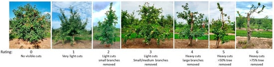 As part of the routine management of the disease, fire blight infected shoots were systematically pruned, inhibiting an accurate evaluation of disease severity as described above. As such, a rating from “0” to “6” was used in the main collection to describe how much infected tissue was removed from the tree. Where “0” represents no visible cuts, “1” represents very light cuts, “2” represents light cuts, small branches removed, “3” light cuts, small and medium branches removed, “4” represents heavy cuts with large branches removed, “5” represents heavy cuts > 50% tree removed and “6” represents heavy cuts > 75% tree removed (Figure 2). Fire blight resistance was inferred based on cut severity, where “0” is likely resistant, “1”, “2”, and “3” are mildly resistant, “4” is moderately susceptible and “5” and “6” are highly susceptible. Small, immature trees were excluded from the analysis, including the samples below the 15th percentile from severity scoring. In total 2525 trees from the main collection were used for downstream analysis.