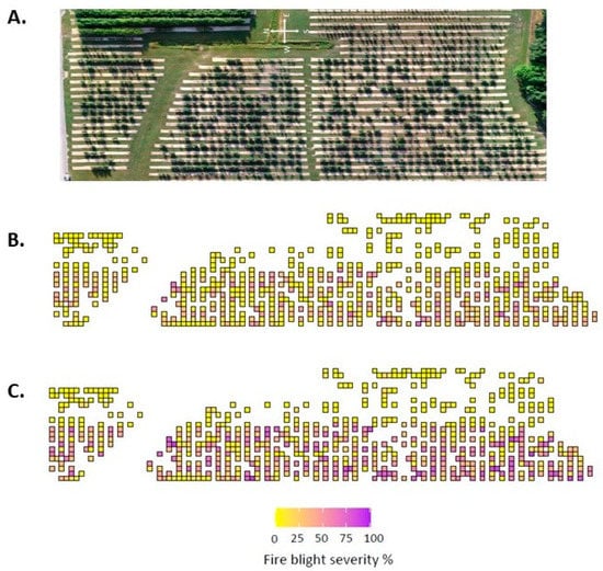 Heat map of fire blight severity for the 667-tree main collection subset. (A) Aerial image of the field. (B) Initial severity average in late June. (C) Severity average 3 weeks later, mid-July. Each square represents a tree. The compass in A. shows the cardinal directions of the field. Fire blight average severity calculated as (number of infected shoots/total number of shoots) × 100 for the west and east facing side of the tree, then averaged together.