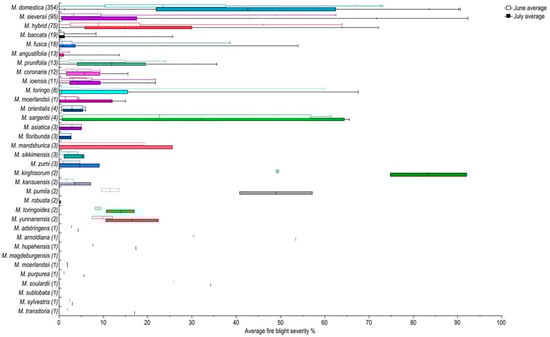 Quantile box plots of 667 main collection subset scored for fire blight severity in June and July. June is shown as open bars and July is shown as filled bars. The box indicates the 25th and 75th quantile and the median is shown as a colored line in the June box and a black line in the July box. The number of trees scored per species is shown in parenthesis. Species are ordered by descending tree count. Box plot colors delimitate species.