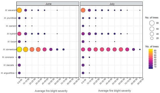 Main collection fire blight severity (%) in June (left) and July (right). The color and size of the circles indicates the number of trees. Only species with 10 or more trees are included in this figure.