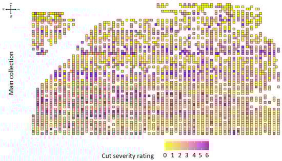 Heatmap of the main collection for cut severity ratings. Each tree is represented by a small box. Heavy cutting is observed throughout the orchard. White areas indicate no tree present. The cardinal directions of the field are shown in the top left corner.