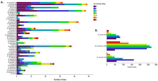 Cut severity ratings for the main collection. The number of trees per rating per species (A) Wild species (B) Malus hybrid, M. domestica, and M. sieversii. A rating of “0” represents no cuts. Ratings of “1”, “2”, and “3” represent light cuts while ratings of “4”, “5”, and “6” represent heavy cuts.