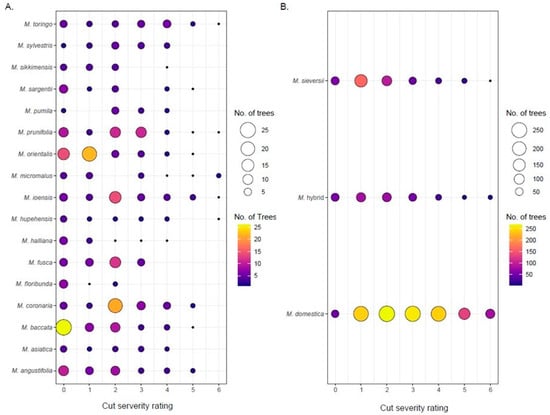 Main collection cut severity ratings with species containing >10 trees. (A) Wild species (B) M. domestica, Malus hybrid and M. sieversii. Circle sizes indicate the number of trees, as do the corresponding colors.