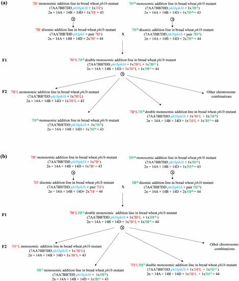 Development of double monosomic H. vulgare and H. chilense addition lines in wheat in the ph1b mutant background. (a) Diagram of genetic crosses developed to obtain the 7HvL7Hch double monosomic addition line in wheat in the ph1b mutant background. (b) Diagram of genetic crosses developed to obtain the 7HvL5Hch double monosomic addition line in wheat in the ph1b mutant background.