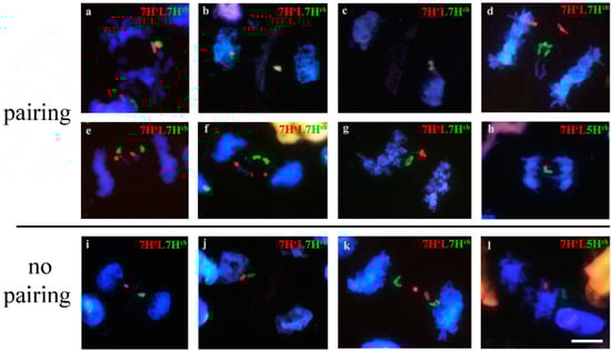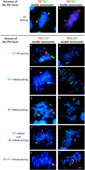Taking into account that homoeologous and non-homoeologous chromosome associations between H chilense and H. vulgare chromosomes did occur in wheat, we focused on studying whether or not these chromosome associations could allow overcrossing and recombination events in the absence of the Ph1 locus. Thus, we analyzed chromosome associations in pollen mother cells (PMCs) in metaphase I from H. vulgare and H. chilense double monosomic addition lines for the same and different homoeologous group in wheat in the ph1b mutant background. 7Hv7Hch and 7Hv5Hch double monosomic additions in wheat in the presence of the Ph1 locus were used as control. Cultivated and wild barley chromosomes remained always as univalent in GISH experiments in metaphase I in the presence of the Ph1 locus, in both situations (same and different homoeologous group, Figure 3a,b), as was previously described [21]. In contrast, several types of associations between H. vulgare and H. chilense chromosomes were detected in the absence of the Ph1 locus for both the same and different homoeologous groups (Figure 3c–l). Associations in metaphase I between H. vulgare and H. chilense, H. chilense and wheat, and H. vulgare and wheat chromosomes were observed (Figure 3c–h) in both 7HvL7Hch and 7HvL5Hch double monosomic addition lines in the ph1b mutant background, as well as double H. chilense-wheat and H. vulgare-wheat associations (Figure 3i,j) and tripartite H. vulgare-H. chilense-wheat associations (Figure 3k,l). The most frequent association in both wheat lines carrying homoeologous (7HvL7Hch) and non-homoeologous chromosomes (7HvL5Hch) occurred between H. vulgare and H. chilense chromosomes (20.85% and 7.26%, respectively, Table 2). Our results showed that recombination was, as expected, more frequent between homoeologous chromosomes than non-homoeologous chromosomes, supporting chromosome associations observed during pachytene between 7HvL and 7Hch chromosomes, which were also more frequent than associations occurring between 7HvL and 5Hch chromosomes. The H. vulgare-H. chilense-wheat tripartite chromosomes association was the least frequent in both lines carrying 7Hv7LHch and 7HvL5Hch chromosomes in the ph1b background (0.47% and 0.33%, respectively) (Table 2). These observations suggested that, although homoeologous chromosomes 7HvL and 7Hch can associate in pairs during pachytene both in the presence and in the absence of the Ph1 locus, recombination can only occur in the absence of the Ph1 locus. In addition, although chromosome associations between non-homoeologues can occur in equivalent chromosome regions, recombination events were rare between non-homoeologues. Moreover, chromosome associations and recombination events between wild or cultivated barley chromosomes and wheat were less frequent, suggesting that chromosome associations might depend on genome homology, as H. chilense and H. vulgare species are phylogenetically closer between them than to wheat. The absence of homologues in the case of Hordeum chromosomes might also contribute to increase chromosome associations between both wild and cultivated barley chromosomes, which did not occur in the case of wheat chromosomes where the two homologues for all wheat chromosomes were always present. In summary, our observations suggested that the Ph1 locus cannot suppress homoeologous chromosome associations in wheat but recombination, because no recombination events were detected between homoeologous H. chilense and H. vulgare chromosomes in any case in the presence of the Ph1 locus.