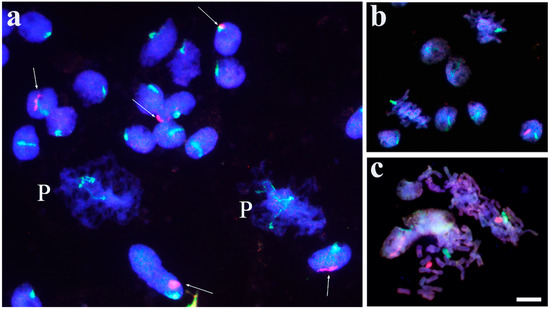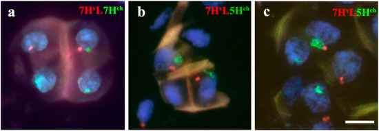 Visualization of barley chromosomes after meiosis in double H. vulgare and H. chilense monosomic addition lines in wheat in the absence of the Ph1 locus. Examples of both H. vulgare (red) and H. chilense (green) chromosomes at the tetrads stage. DNA was counterstained with DAPI (blue). (a) Hordeum vulgare and H. chilense chromatin detected in two and three PMCs, respectively, in the double monosomic 7HvL7Hch in wheat in the ph1b mutant background. (b) 7HvL5Hch chromosomes detected simultaneously in two PMCs in wheat in the ph1b mutant background. (c) Hordeum vulgare and H. chilense chromatin detected in three and three PMCs, respectively, in the double monosomic 7HvL5Hch in wheat in the ph1b mutant background. Bar: 10 µm.